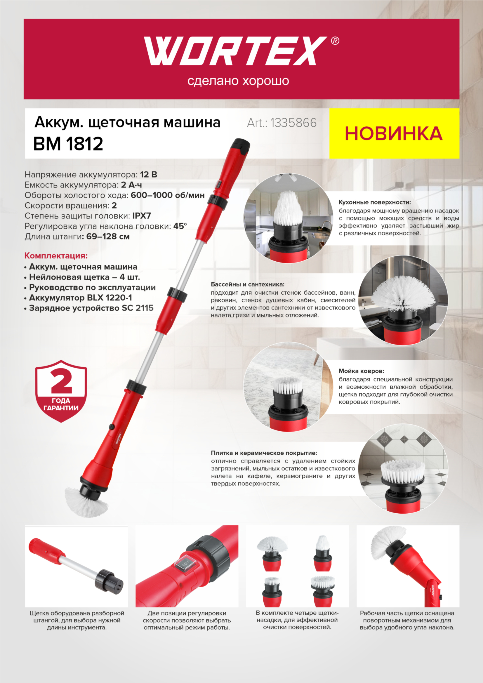 Щетка для уборки аккумуляторная WORTEX BM 1812 - это универсальное устройство, предназначенное для эффективной влажной очистки сильно загрязненных поверхностей. Благодаря влагозащищённой рабочей части и возможности использования воды и моющих средств, она идеально подходит для обработки различных типов поверхностей в домашних и коммерческих условиях. Зона применения: - Плитка и керамическое покрытие: отлично справляется с удалением стойких загрязнений, мыльных остатков и известкового налета на кафеле, керамограните и других твердых поверхностях. - Мойка ковров: благодаря специальной конструкции и возможности влажной обработки, щетка подходит для глубокой очистки ковровых покрытий, особенно в местах с сильными загрязнениями или пятнами. - Бассейны и сантехника: идеально подходит для очистки стенок бассейнов, ванн, раковин, стенок душевых кабин, смесителей и других элементов сантехники от известкового налета, грязи и мыльных отложений. - Кухонные поверхности: благодаря мощному вращению насадок с помощью моющих средств и воды эффективно удаляет застывший жир с различных поверхностей - плитки, кухонных стенок, варочных панелей и других материалов. Дополнительное оснащение: В комплекте поставляются четыре щетки-насадки разной формы, специально разработанные для эффективной очистки поверхностей различной формы и размеров. Они позволяют легко добраться до труднодоступных участков, углов, швов и узких пространств, обеспечивая максимально качественную уборку. Регулировка скорости: В устройстве предусмотрены две позиции регулировки скорости, что позволяет выбрать оптимальный режим работы в зависимости от материала поверхности и степени загрязнения. Это обеспечивает бережную обработку деликатных материалов и более интенсивную очистку сильно загрязненных участков. Поворотная рабочая часть: Рабочая часть щетки оснащена поворотным механизмом, что обеспечивает возможность выбора удобного угла наклона. Это значительно облегчает работу в труднодоступных местах, позволяет лучше контролировать направление движения и достигать сложных участков без лишних усилий. Разборная штанга: Щетка оборудована разборной штангой, которая позволяет выбрать оптимальную длину инструмента под конкретные задачи. Это удобно при работе на высоких или труднодоступных участках - можно регулировать длину для комфортного использования или компактного хранения.