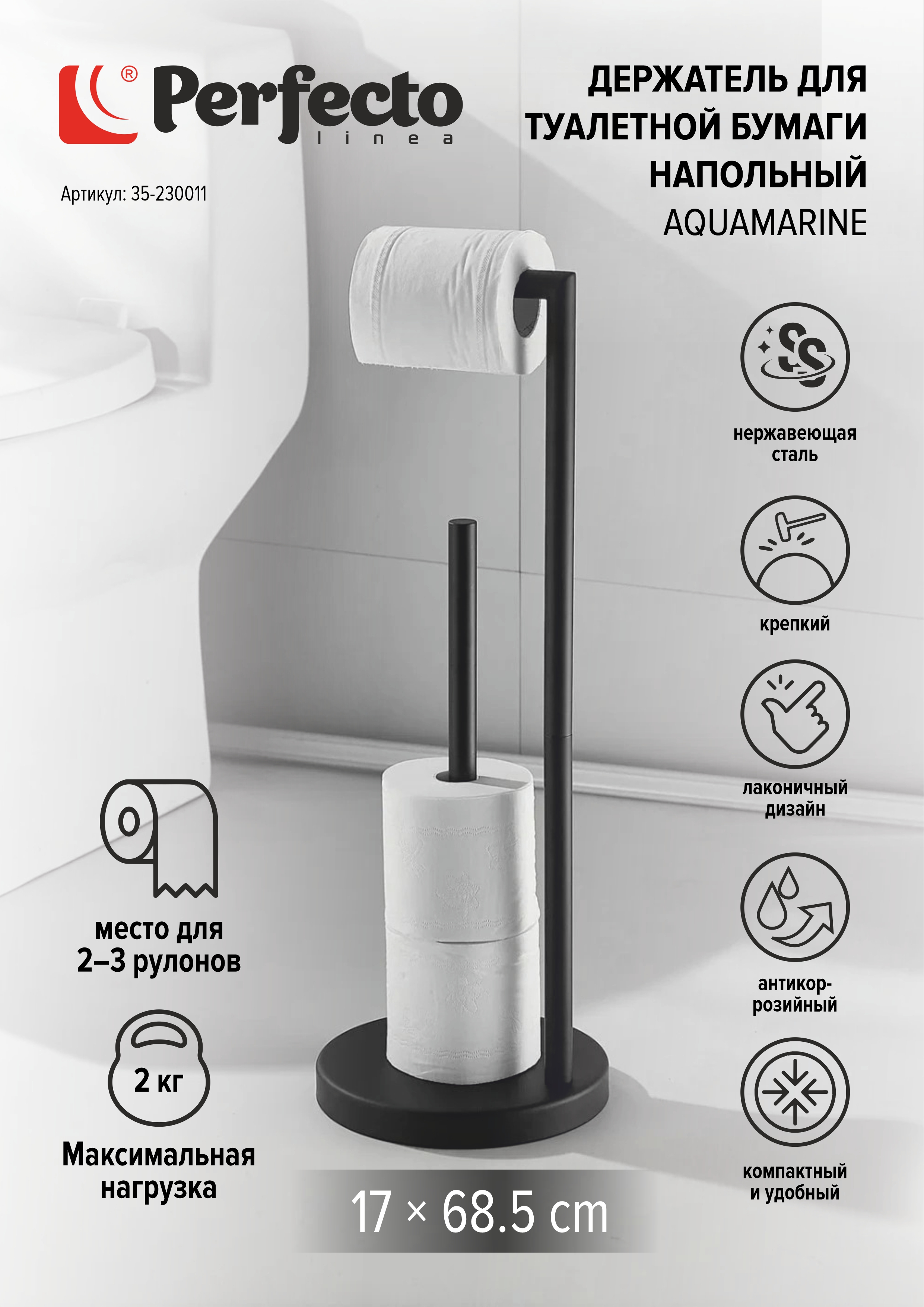 Держатель для туалетной бумаги напольный AQUAMARINE, нержавеющая сталь/чёрный, PERFECTO LINEA (Размер: 17х68,5 см)