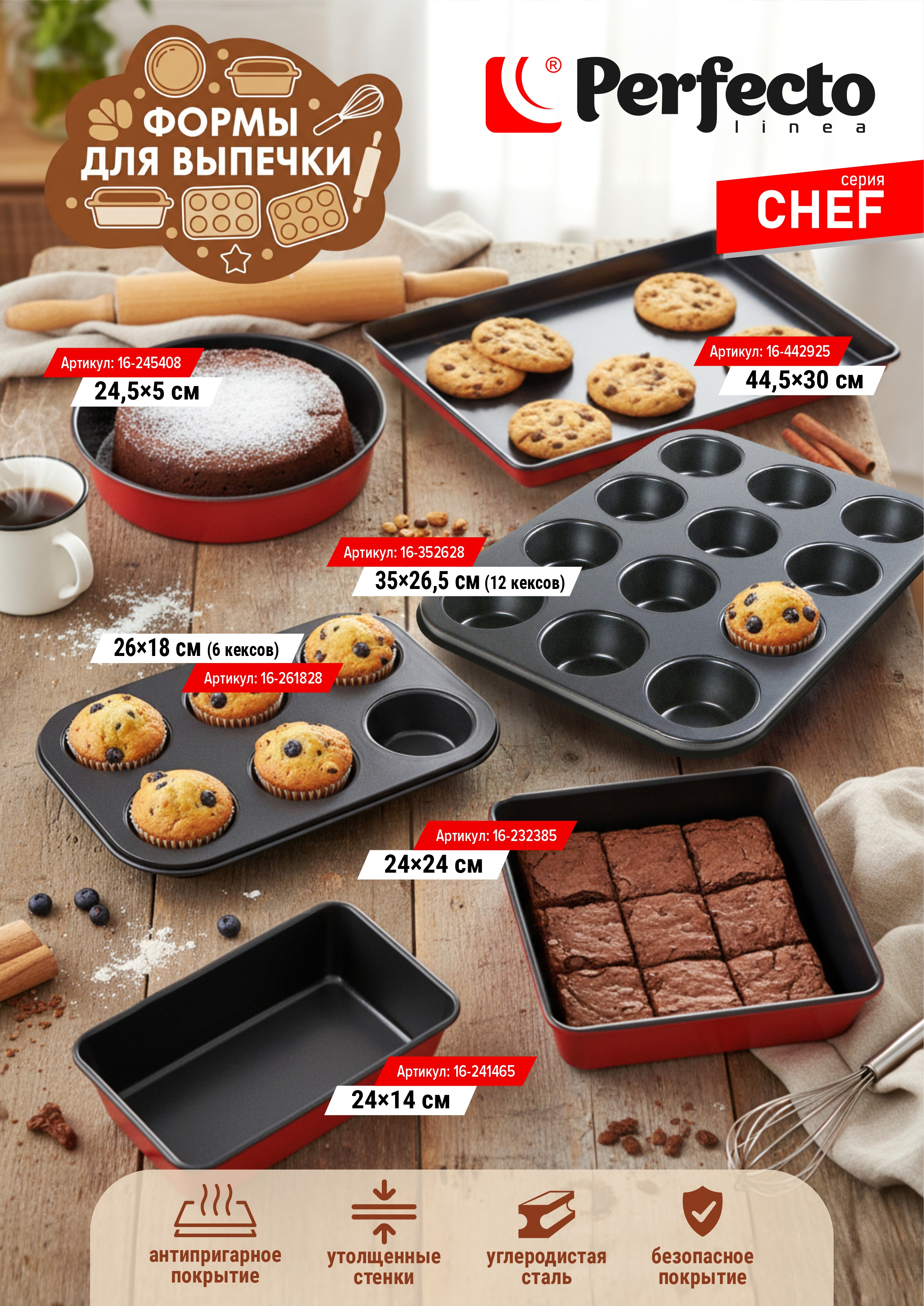Формы для выпечки серии CHEF, ТМ PERFECTO LINEA предназначены для приготовления пищи в духовых шкафах. Формы выполнены из углеродистой стали высокого качества с внутренним антипригарным покрытием. Во время готовки пища не прилипает, не пригорает, что облегчает готовку. Формы рекомендуется использовать с силиконизированной бумагой для выпечки. Мыть формы рекомендуется мягкими губками для мытья, допускается использование посудомоечных машин. Не рекомендуется использование форм в кислотной среде, абразивных моющих средств, острых предметов, а так же хранение форм в ходольнике