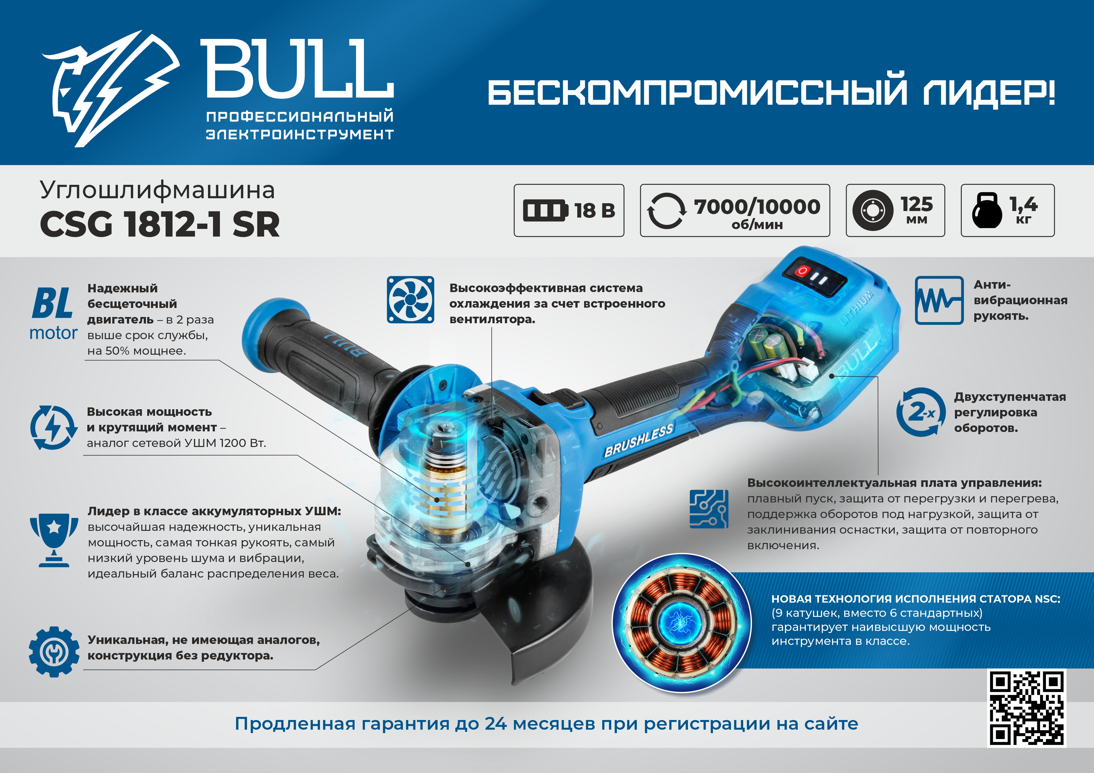 Аккум. углошлифмашина BULL CSG 1812-1 SR Xcase XLTpro 2x6 Ач БЕСЩЕТ, 125 мм, рег. об., 10 000 об/мин (Безредукторный тип, плав пуск, конст. эл., защита от перегруз. и перегрев.)