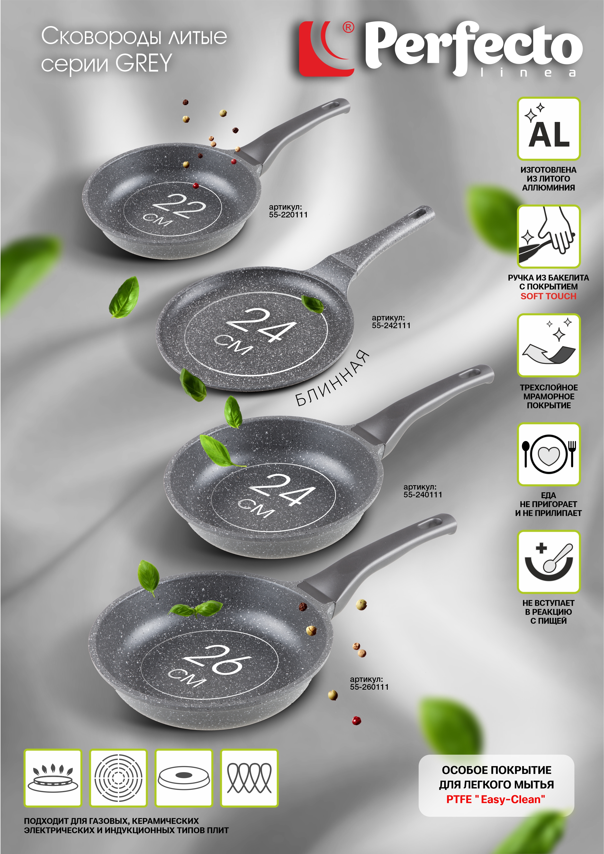 Сковорода литая ф 24х5.5 см, алюм., антиприг. покр., для индукц. плит, серия Grey, PERFECTO LINEA