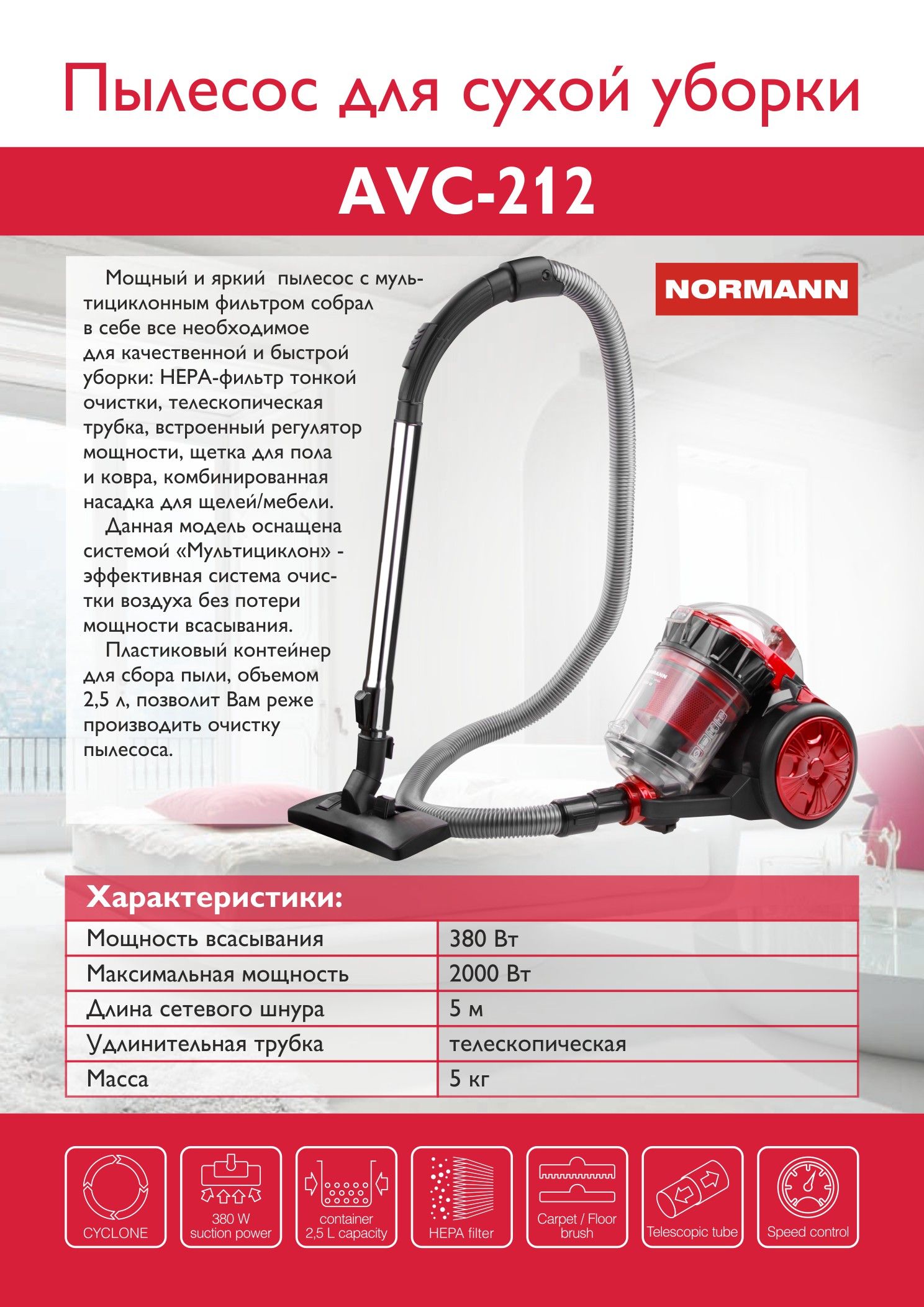 Пылесос бытовой NORMANN AVC-212 (2000 Вт; Мультициклон; Контейнер 2,5 л; Радиус действия 8 м)