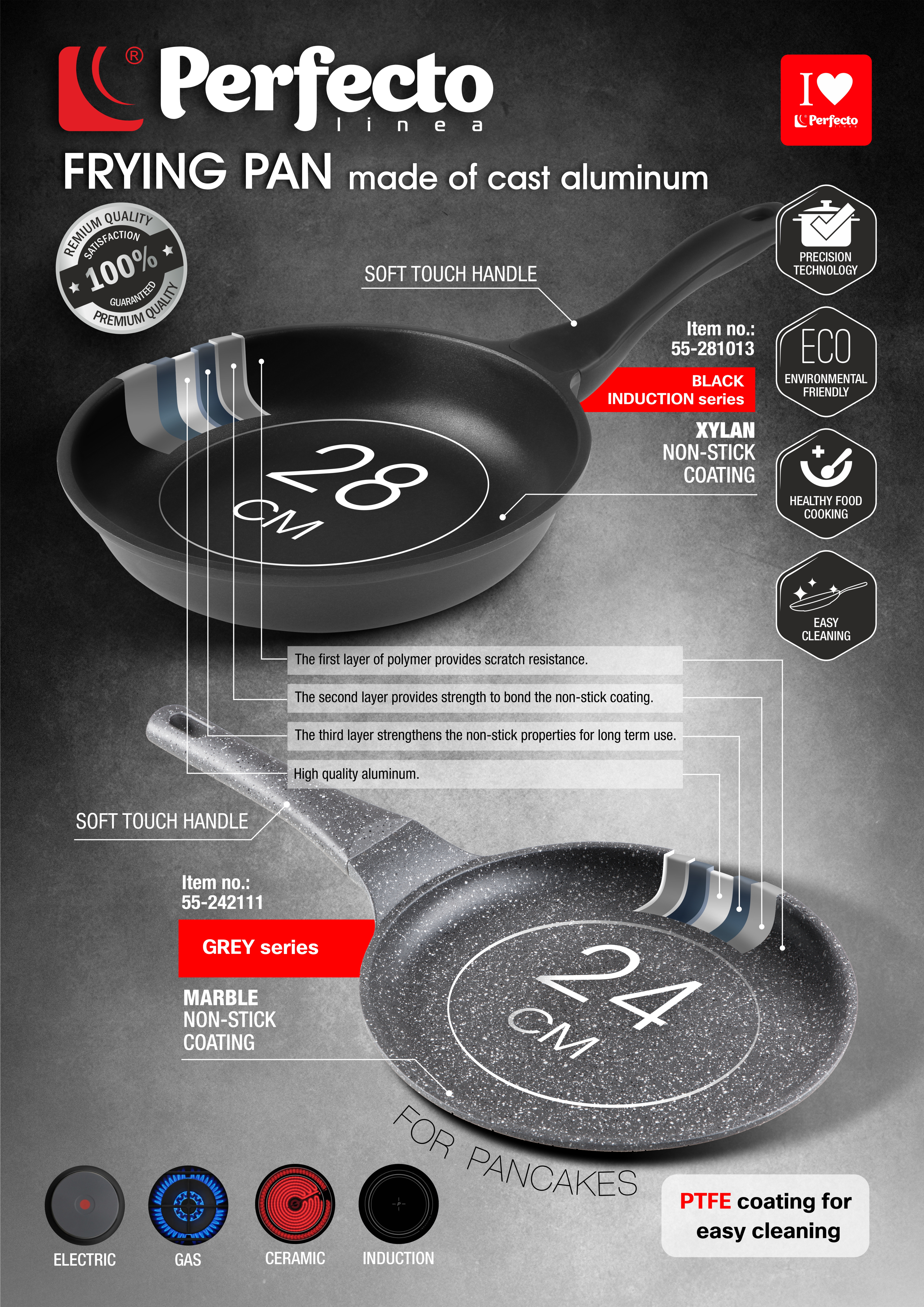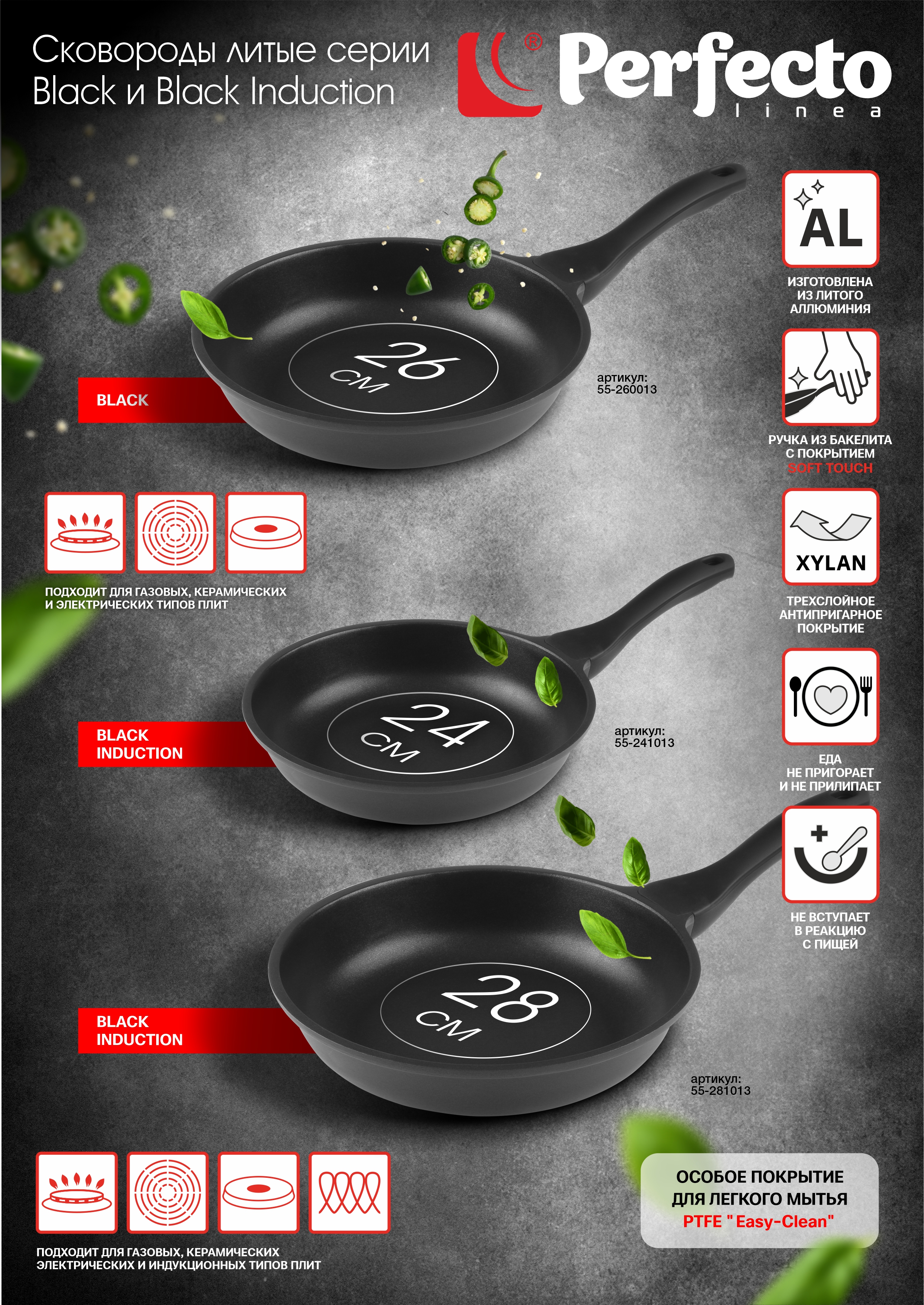 Сковорода литая ф 28х6.0 см, алюм., антиприг. покр., серия Black Induction, PERFECTO LINEA (подходит для всех типов плит, включая индукцию)