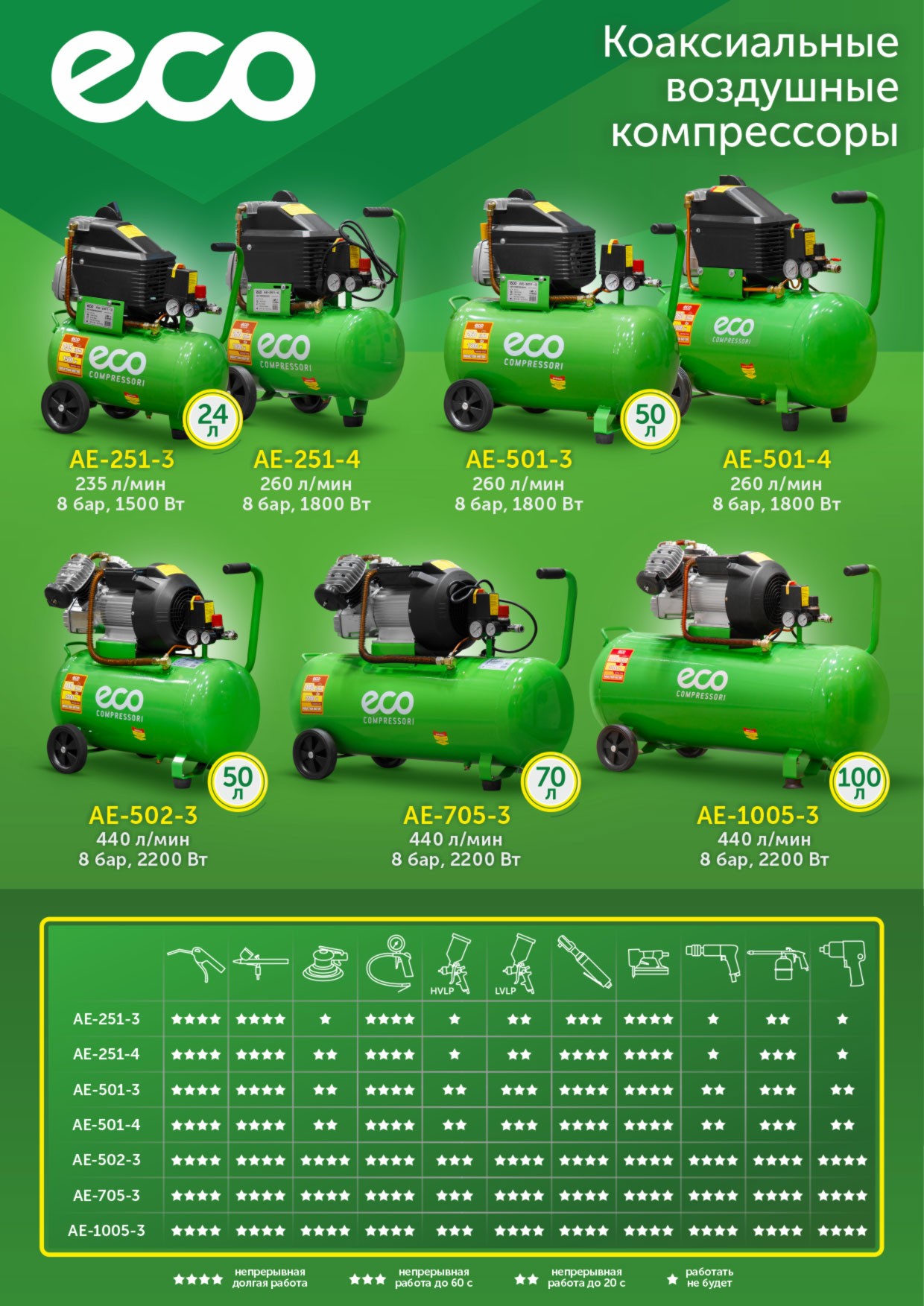 Компрессор ECO AE-501-3 коаксиальный (260 л/мин, 8 атм, коаксиальный, масляный, ресив. 50 л, 220 В, 1.80 кВт)