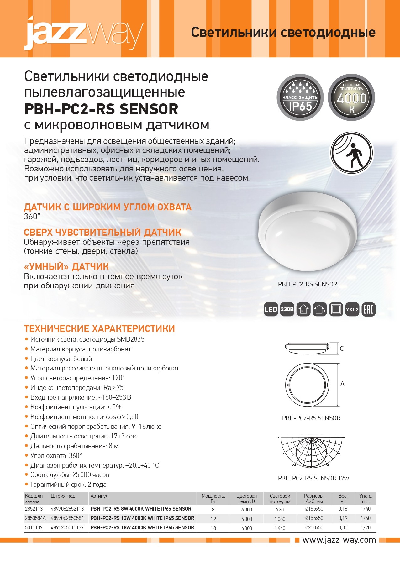 Светильник светодиодный накладной 12 Вт PBH - PC2-RS 4000К, IP65, 180-265В, с драйвером JAZZWAY (900Лм, нейтральный белый свет светильник сенсорный)